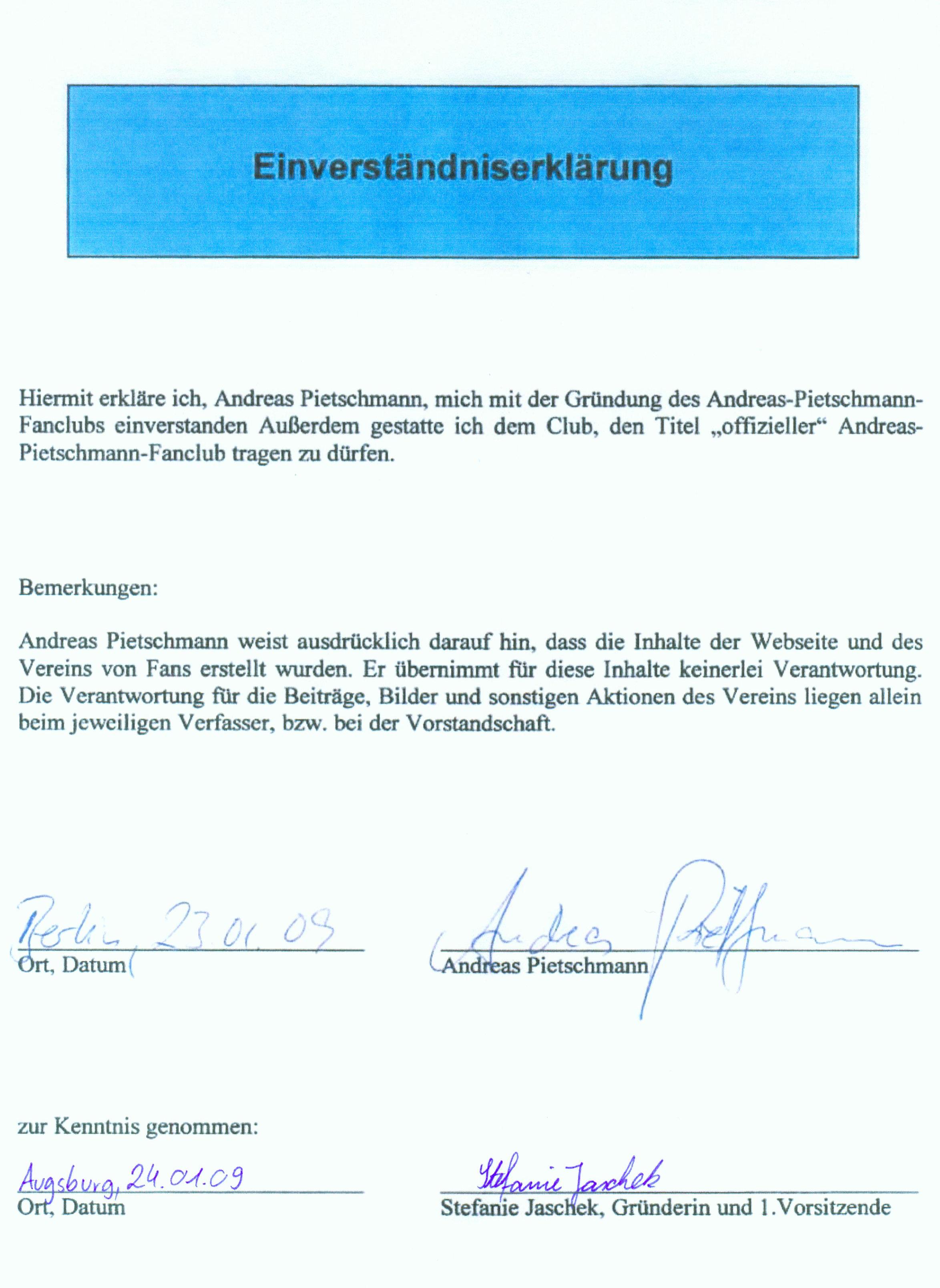Damit auch alle glauben, dass das hier wirklich der offizielle Fanclub von Andreas Pietschmann ist, gibts hier seine Einverständniserklärung zu sehen. Darauf sind wir alles besonders stolz.